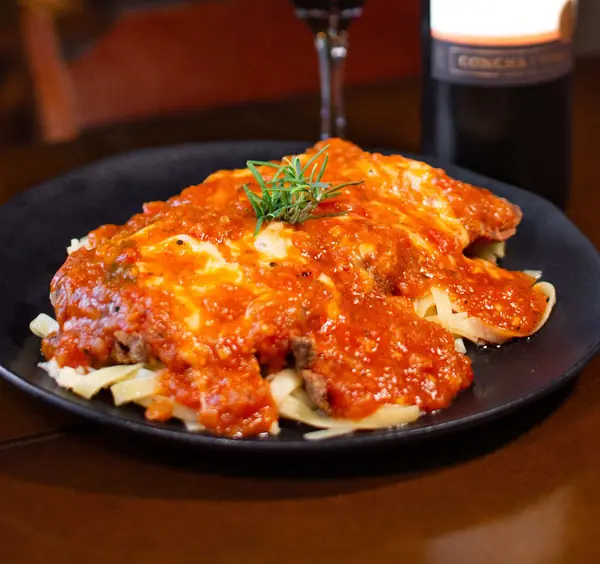 200gr de File mignon empanados, sobre delicioso fettuccine e coberto com molho a parmigiana finnus.