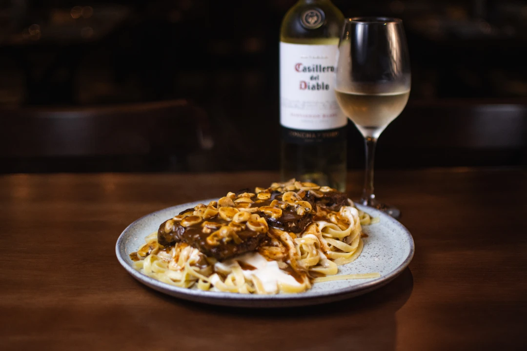 200gr de Tornedores de File mignon, sobre delicioso fettuccine e coberto com molho gorgonzola.