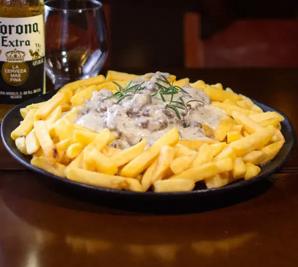 400gr de file mignon grelhado em tiras com 400gr de batata frita coberto com molho gorgonzola.
