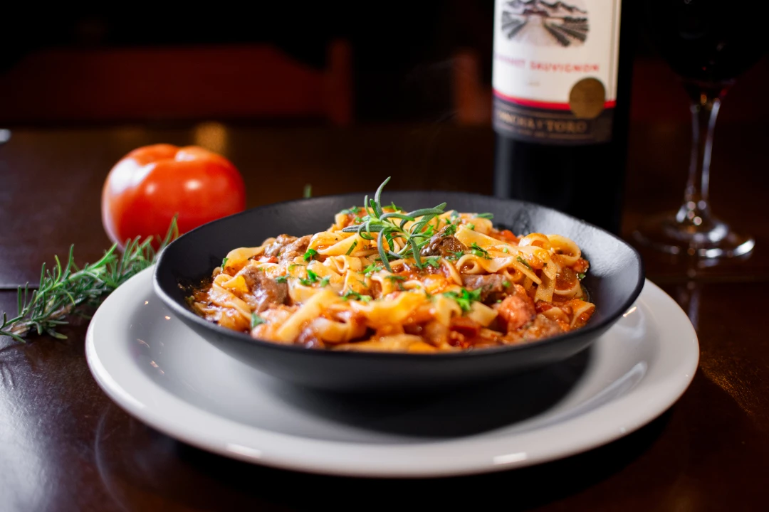 Pasta fettuccine, molho de tomate ao sugo, filé mignon, bacon em cubos, cebola e orégano.
