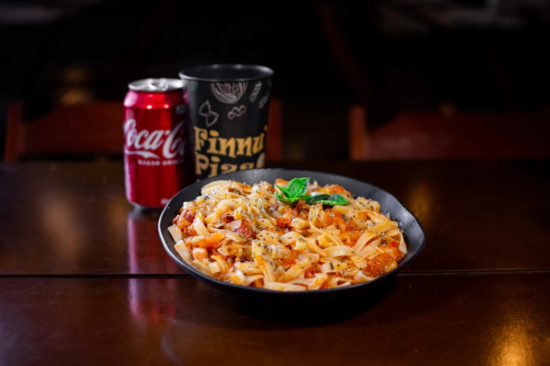 Pasta fettuccine, molho de tomate ao sugo, filé mignon, bacon em cubos, cebola e orégano.
