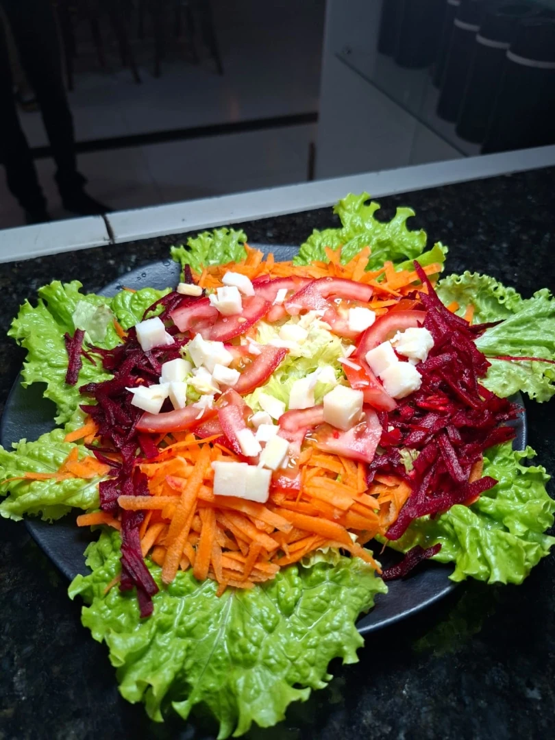 Alface Americana, Tomates, Cenouras Ralada, Beterraba Ralada e Palmito Picado.