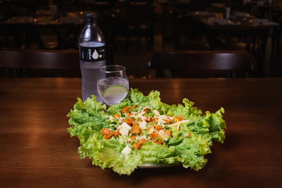 Frango grelhado, alface americana, queijo parmesão ralado e molho caesar.